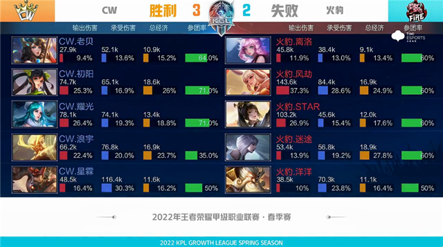 3月28日2022年K甲春季赛常规赛第六周第六日第三场比赛,由火豹对阵CW,以下是本场比赛快讯